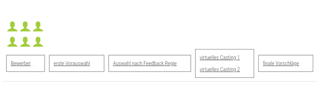 So gibt es z.B. nach einer ersten Recherche oft auch weitere Runden wie Live-Castings oder diverse Feedbackrunden mit ihrem Team. Nach jeder Runde wird die Anzahl der möglichen Kandidaten kleiner – bis Sie am Ende Ihre Besetzung gefunden haben. Bei etalenta können Sie Ihren Castingprozess genau abbilden und bestimmte Kandidaten einfach in die “nächste Runde” verschieben.