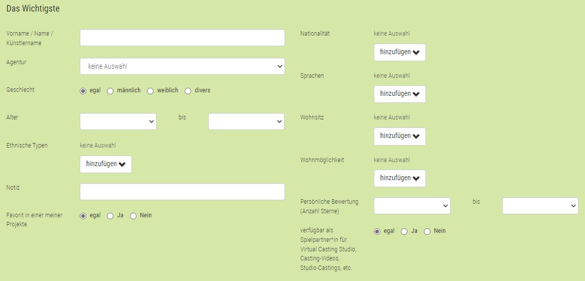 Unsere Suchfunktion bietet Ihnen die Möglichkeit schnell oder auch sehr differenziert unter mehr als 70.000 Schauspielern in ganz Europa zu suchen. Insgesamt stehen Ihnen mehr als 40 Suchkriterien zur Verfügung. Von der Suche nach Namen, Fähigkeiten, Standorten und Eigenschaften bis hin zur Suche nach Ihren eigenen Notizen. Sie können sogar eine Ähnlichkeitssuche durchführen: Laden Sie ein Foto hoch, z.B. von einer historischen Person oder ein Mood-Foto und Sie erhalten dann Schauspieler*innen angezeigt, die der Person auf dem Foto ähnlich sehen.
